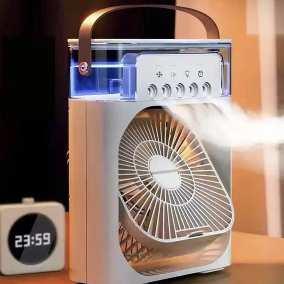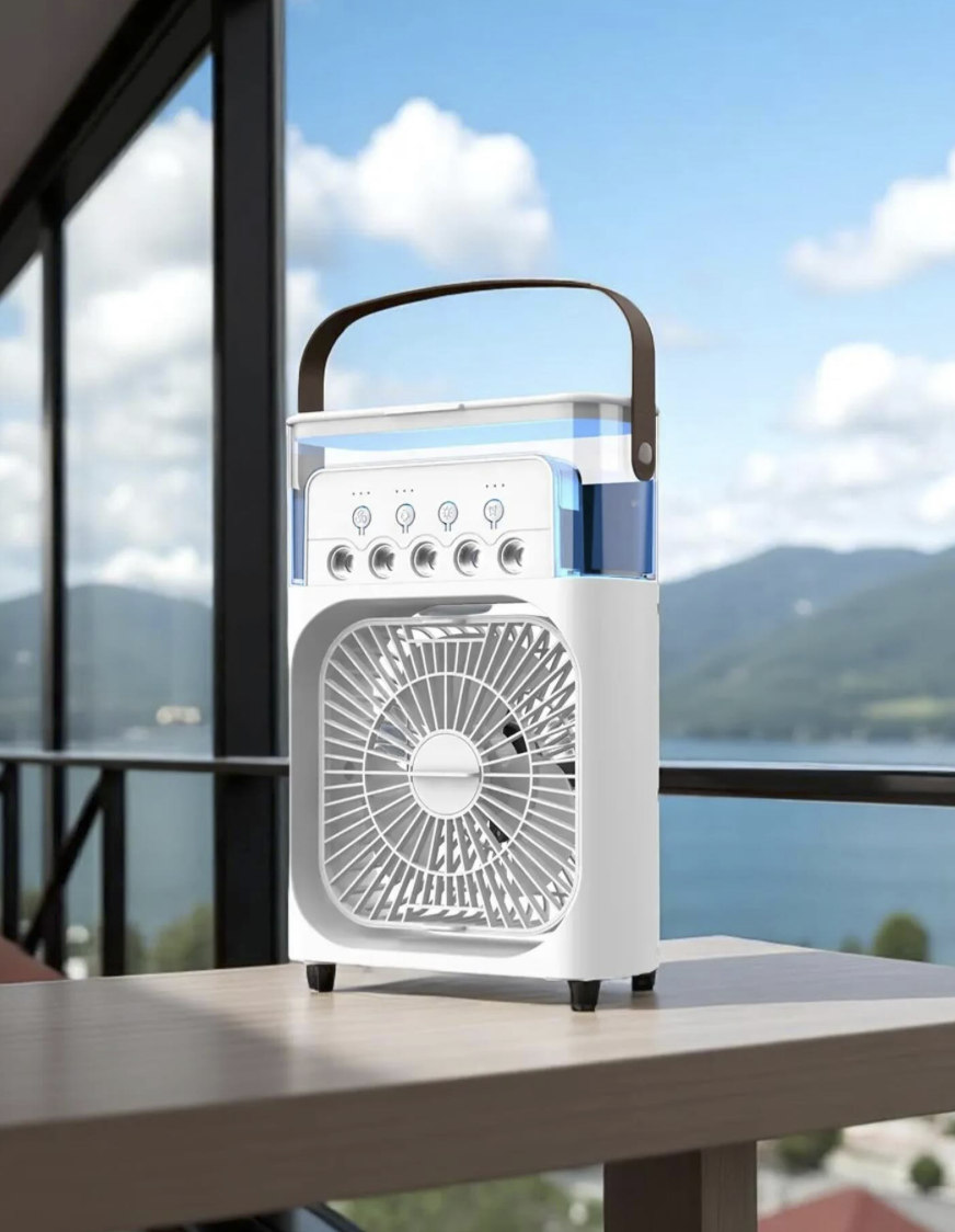 Üstten doldurulabilir su tankına su veya buzlu su ekleyin ve düğmeye basın; kişisel bir hava soğutucusu, masa vantilatörü, nemlendirici ve LED rahatlatıcı ışık olarak kullanabileceğiniz çok yönlü bir üründür.